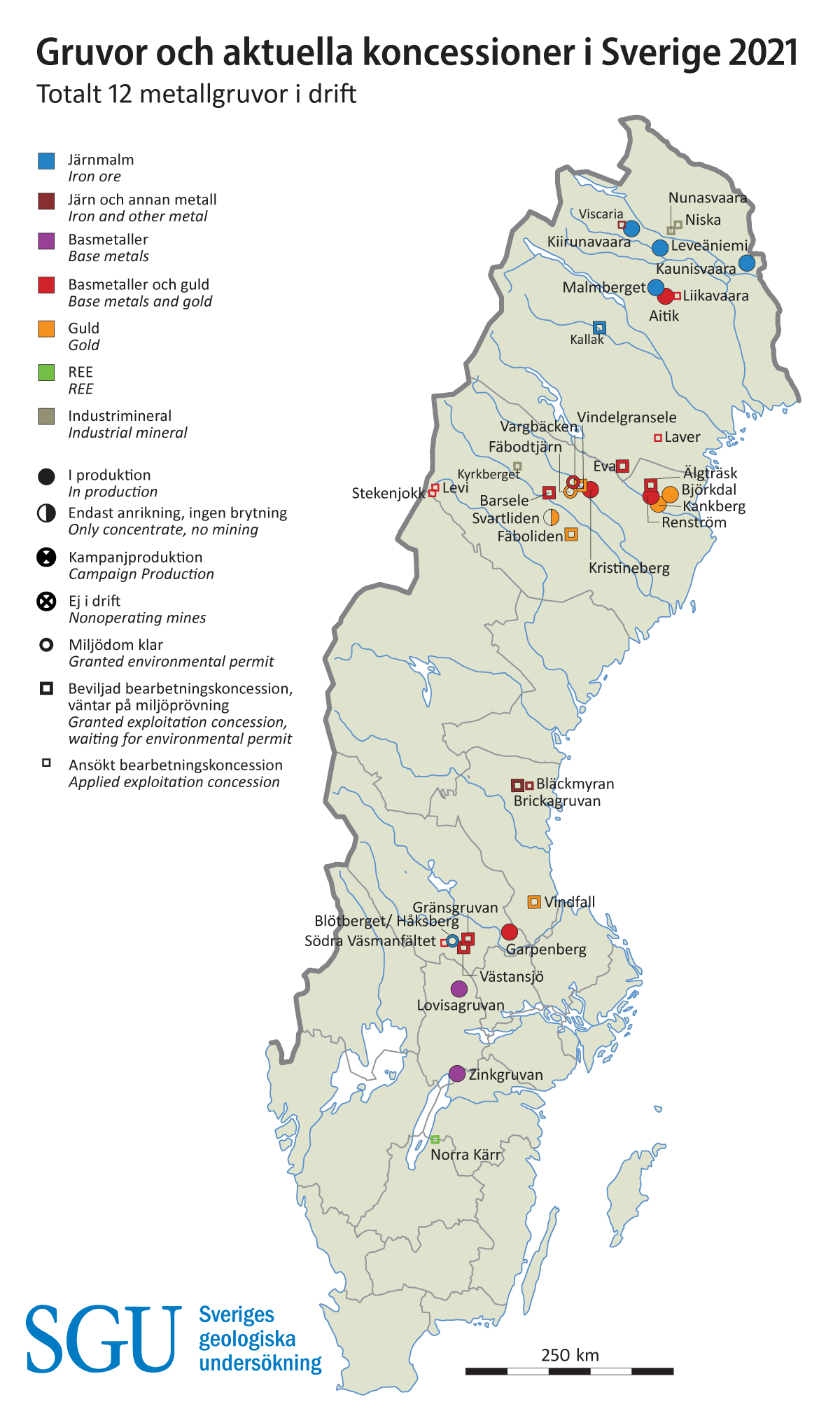 스웨덴 광물 산지 분포도 (자료 : 위키피디아)