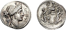 ![]() Coin of Faustus Sulla, with the reverse depicting the Mauretanian king Bocchus I (left) offering Jugurtha (right) to Faustus' father Lucius Sulla. |