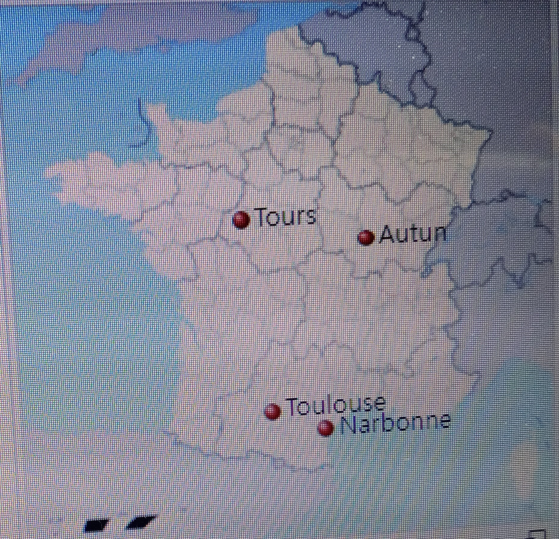 Modern-day French borders. Septimania runs along the Mediterranean (southeast) coast from the Spanish border, and Aquitaine is along the Atlantic (west) coast running north from Spain.