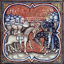 ![]() Charles de Steuben's Bataille de Poitiers en octobre 732 romantically depicts a triumphant Charles Martel (mounted) facing Abdul Rahman Al Ghafiqi (right) at the Battle of Tours. |