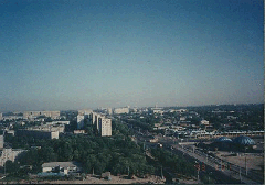 <타슈켄트 호텔 서북방향 정경>타쉬켄트 호텔 서북방향 정경-우즈베키스탄의 수도로서 인구 212만명 정도의 도시. 천산산맥[天山山脈]에 있는 오아시스에 위치하고 시르다르야강(江)의 지류에 접한다. 아시하바드 철도·오렌부르그철도와 그 밖에 두 지선(支線) 철도가 집결되며 천산산맥으로 가는 자동차 도로의 기점이기도 하다. 또한 모스크바·트빌리시·바쿠·알마타·부하라·뉴델리 등지로 가는 공로(空路)가 있다. 7∼8세기에는 투르크계 문화와 이슬람교를 받아들였으며 10세기에는 사만왕조가 지배하였다. 뒤에 몽골의 지배로 바뀌어 차가타이 한과 티무르의 지배를 받았다. 16세기부터 남하하는 우즈베크인의 셰이바니왕조 치하에 들어갔다가 코칸트와 부하라의 양 한국에 귀속되었다. 1865년 러시아군이 점령하여 1867년부터 투르키스탄 총독부가 설치되었다. 그 후 러시아의 중앙아시아 지배의 중심지가 되었다. 사진은 타쉬켄트 한 호텔에서 바라본 시내의 정경이다.