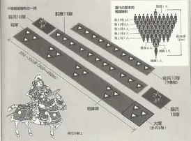 당군 편제의 기본 단위가 되는 것은 50명 단위인 '대(隊)'였고, 전시에 1개 대를 지휘하는 것은 '대두(隊頭)'였다. 이 '대' 의 특징은 3각 대형이라는 것이다. 맨 선두에 지휘관인 대두가 서고, 그 바로 뒤에 기수(집기, 執旗) 1명, 기수의 호위병인 대부 2명이 선다. 대부 뒤에는 5개 열이 늘어서는데, 1열은 7명이었고 한 열씩 뒤로 갈수록 1명이 증가해 5열에는 11명이 섰다. 대열의 최후미에는 부대장격인 대부(隊副)가 큰 칼을 들고 병사들을 감시하였다.