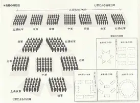 1열의 경우 3개 대를 삼각형 형태로 묶어 대대를 구성하였다. 중군의 경우 이러한 대대가 5개 존재했다. 최선두 대를 전봉대(戰鋒隊), 후방의 2개 대를 전대(戰隊)로 편성했으며, <전략전술병기대사전>에 따르면 전봉대와 전대는 둘 다 보병이지만, <위공이정병법>에 따르면 전봉대는 기병과 보병이 반반으로 섞여 있다고 한다. 전봉대는 최선봉 부대이므로 그만큼 정예한 부대였을 것이다. 2열의 경우 주대(駐隊)라고 불렀는데, 마찬가지로 <위공이정병법>에 따르면 이 주대는 전투 마차를 구비한 부대였으며, 이를 방어선으로 늘여세웠을 것으로 보인다. 주대의 보병 대(隊)는 11개였다. 그리고 그 좌우에 마군 각 10대 500명을 배치하는데, 이들 마군은 보통은 하마해 있다가 기병 운용이 필요할 때에 말에 오른다. 3열은 기병(奇兵, 예비대) 10개 대가 위치해 있었다. 여타 부대는 중군에 비해 그 규모가 적으므로 그만큼 병력을 차감해 포진했을 것이나, 전열 편성 자체는 동일했던 것으로 보인다.