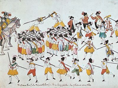 Hilt-and-point dances are widely distributed through Europe—e.g., in northern England, Basque territory, and Spain. They are often performed as part of a folk play. The plays are closely related to the English mummers plays and parallel the Greek folk play in Thrace. In the dance the swords are interlocked at one point, forming a “rose,” or “lock,” that is held aloft and placed around the neck of a performer in mock decapitation. Often the “beheaded” falls “dead,” to be revived by a “doctor,” a fool, a man-woman, or other character. The roots of these dances are in ancient vegetation rites of death and renewal, possibly in sacrifice of a leader to ensure fertility. Even today they are believed to bring luck or well-being.