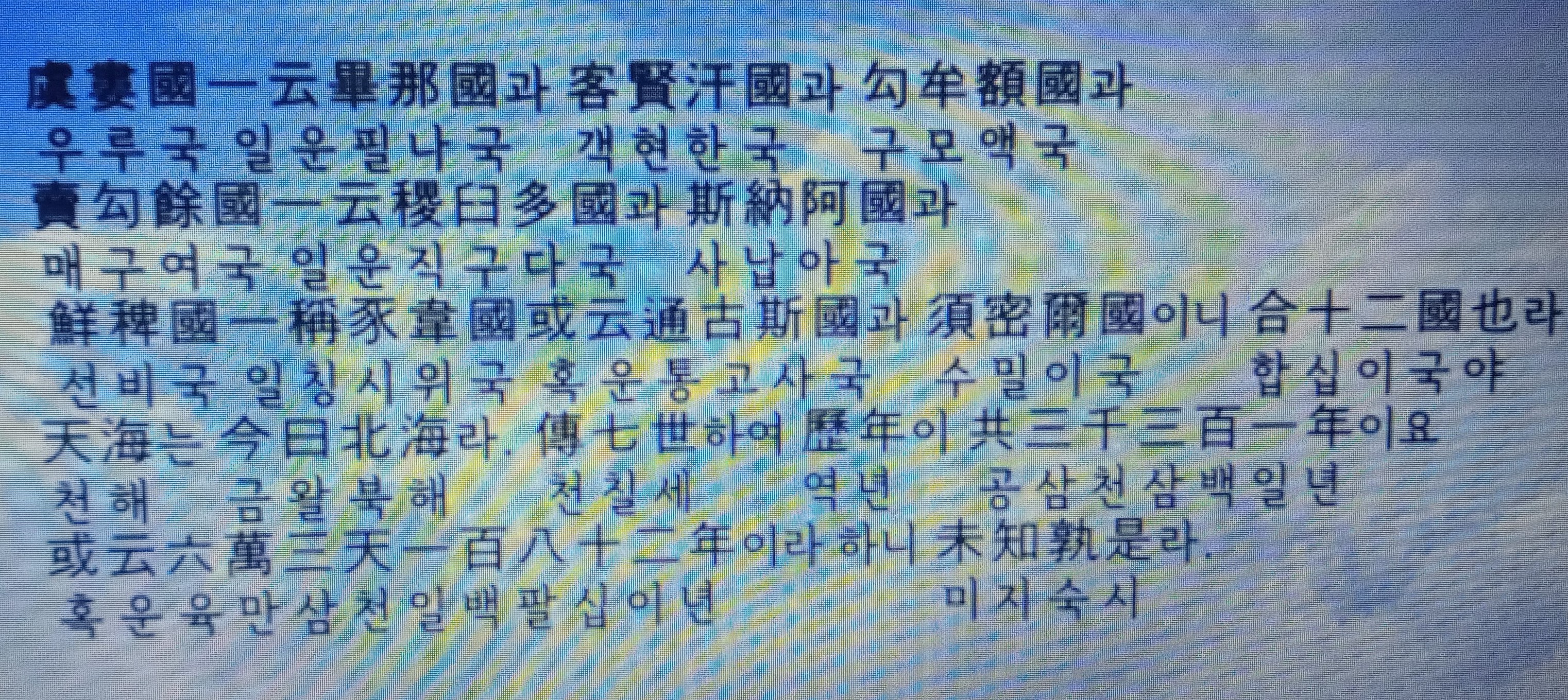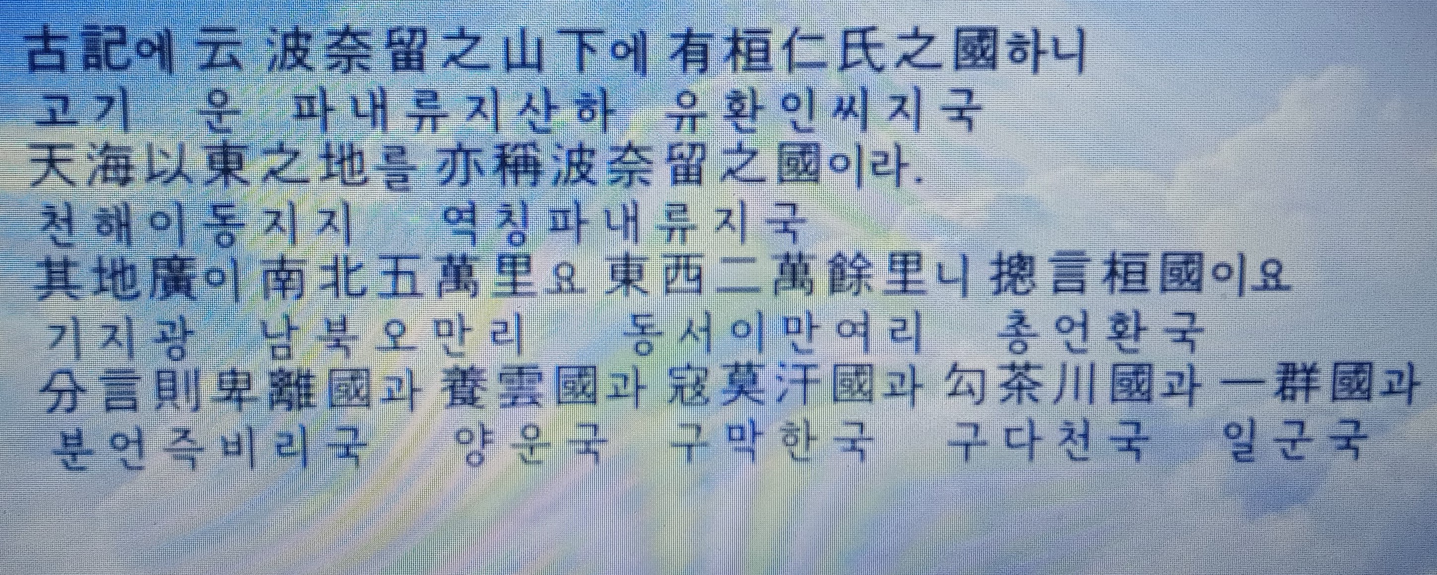 "고기에 말하길 파내류산 아래 환인씨의 나라가 있었다. 천해의 동쪽지역인데, 또한 파내류의 나라라고도 칭한다. 그 땅이 넓어 남북 오만리 동서 2만리이며 모두 환국이라 한다. ......천해는 지금의 북해이다. "