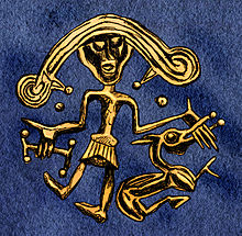 Scholars propose that a variety of objects from the archaeological record depict Týr. For example, a Migration Period gold bracteate from Trollhättan, Sweden, features a person receiving a bite on the hand from a beast, which may depict Týr and Fenrir.[e] A Viking Age hogback in Sockburn, County Durham, England may depict Týr and Fenrir.[35] In a similar fashion, a silver button was found in Hornsherred, Denmark, during 2019 that is interpreted to portray Týr fighting against the wolf Fenrir.[36]