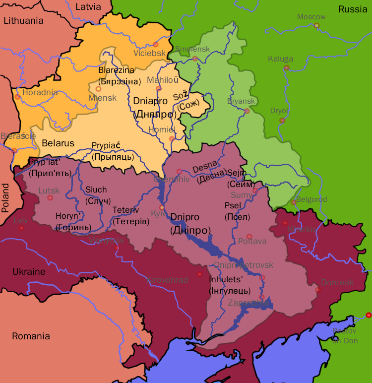 ![]() The Dnieper and the Desna rivers' drainage basin. In this map, Belarus is shown in yellow, Russia in green and Ukraine in deep red. |
