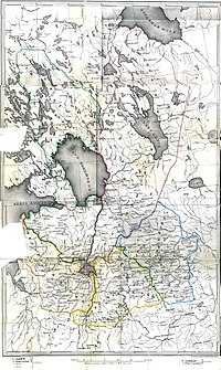 Some territories of relatively late Novgorod colonization were not included in the five–fold division and formed a number of volosts that were in a special position: Zavolochye or Dvinskaya land – along the Northern Dvina from Onega to Mezen. This volost was called so because it was located behind the portage – the watershed separating the Onega and Northern Dvina basins from the Volga basin and was located behind the Obonezhskaya and Bezhetskaya pyatins, where the portages to the Onega river (Poonezhie) began. Perm – in the basin of the Vychegda River and the upper Kama. Pechora – beyond the Dvina land and Perm to the north–east on both banks of the Pechora River to the Ural Range. Ugra – on the eastern side of the Ural Range.[11] Tre or Tersky Coast[44] – on the White Sea coast.