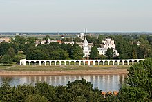The trade rows (of which only the arcade survived) and the Cathedral of the Sign (far in the background) on the Trade Side of Novgorod were built in the 17th century