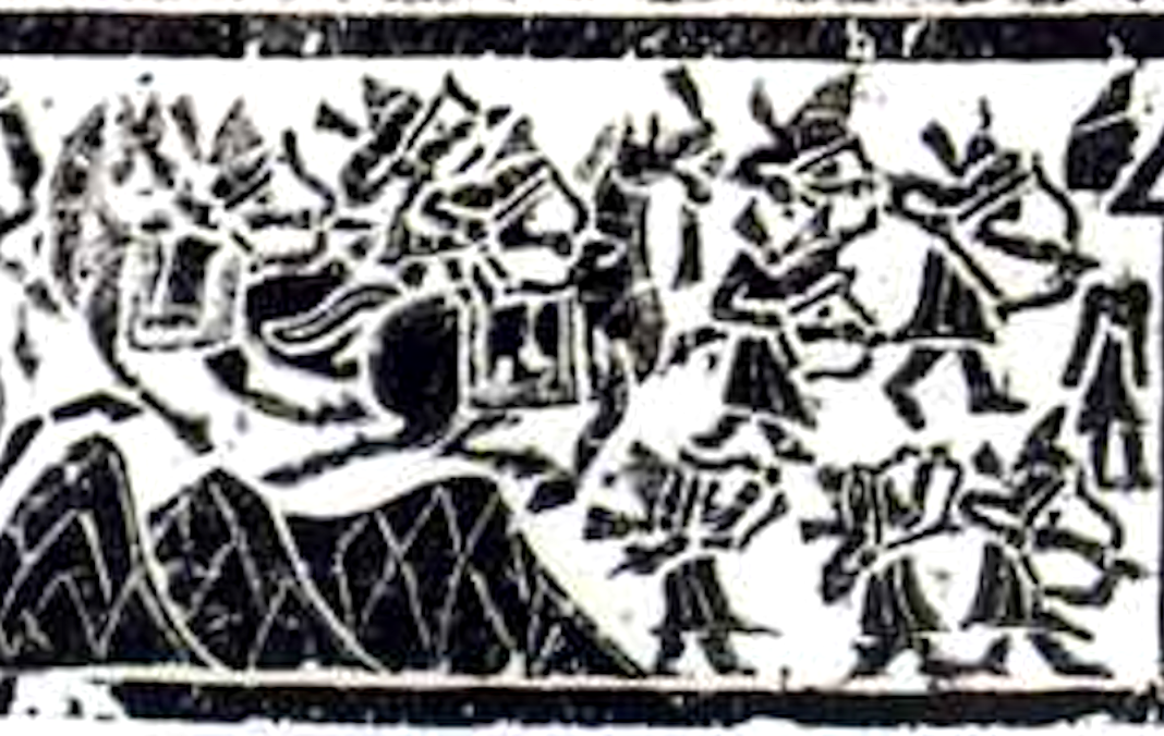 - Yinan tombs relief, depicting an attack by Hu barbarians with pointed hats, bow and arrows. 2nd century AD, Eastern Han.[241]