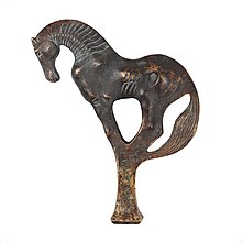 The Heavenly Horse, commonly known as the Ferghana Horse, is an ancient ceremonial bronze finial. It originates from Bactria, dating back to the 4th-1st century BC, and was skillfully crafted by Saka tribes.