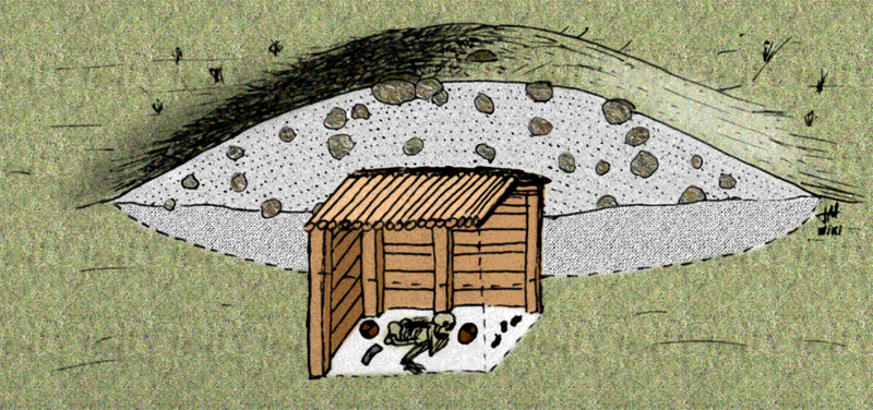The Srubnaya culture is named for its use of timber constructions within its burial pits. Its cemeteries consisted of five to ten kurgans. Burials included the skulls and forelegs of animals and ritual hearths. Stone cists were occasionally employed.[3] Srubnaya settlements consisted of semi-subterranean and two-roomed houses. The presence of bronze sickles, grinding stones, domestic cattle, sheep and pigs indicate that the Srubnaya engaged in both agriculture and stockbreeding.[3]