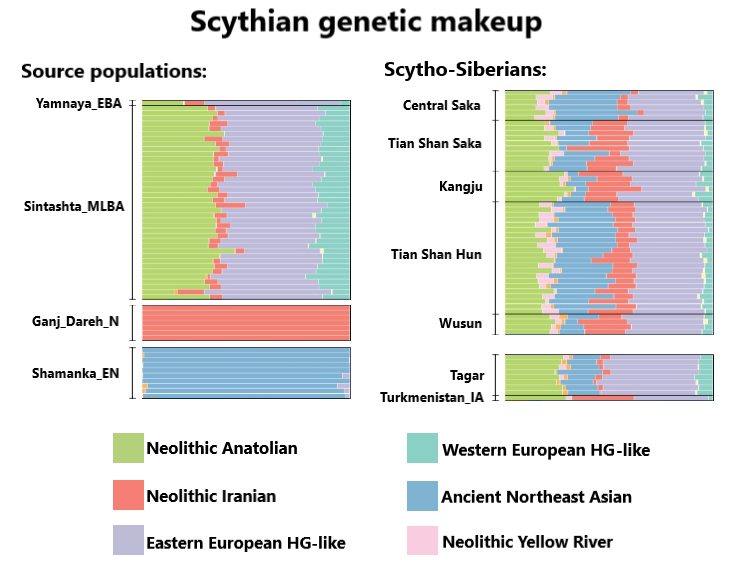 Admixture proportions of Srubnaya populations. They combined Eastern Hunter Gatherer ( EHG), Caucasian Hunter-Gatherer ( CHG), Anatolian Neolithic ( ) and Western Hunter Gatherer ( WHG) ancestry.[9]