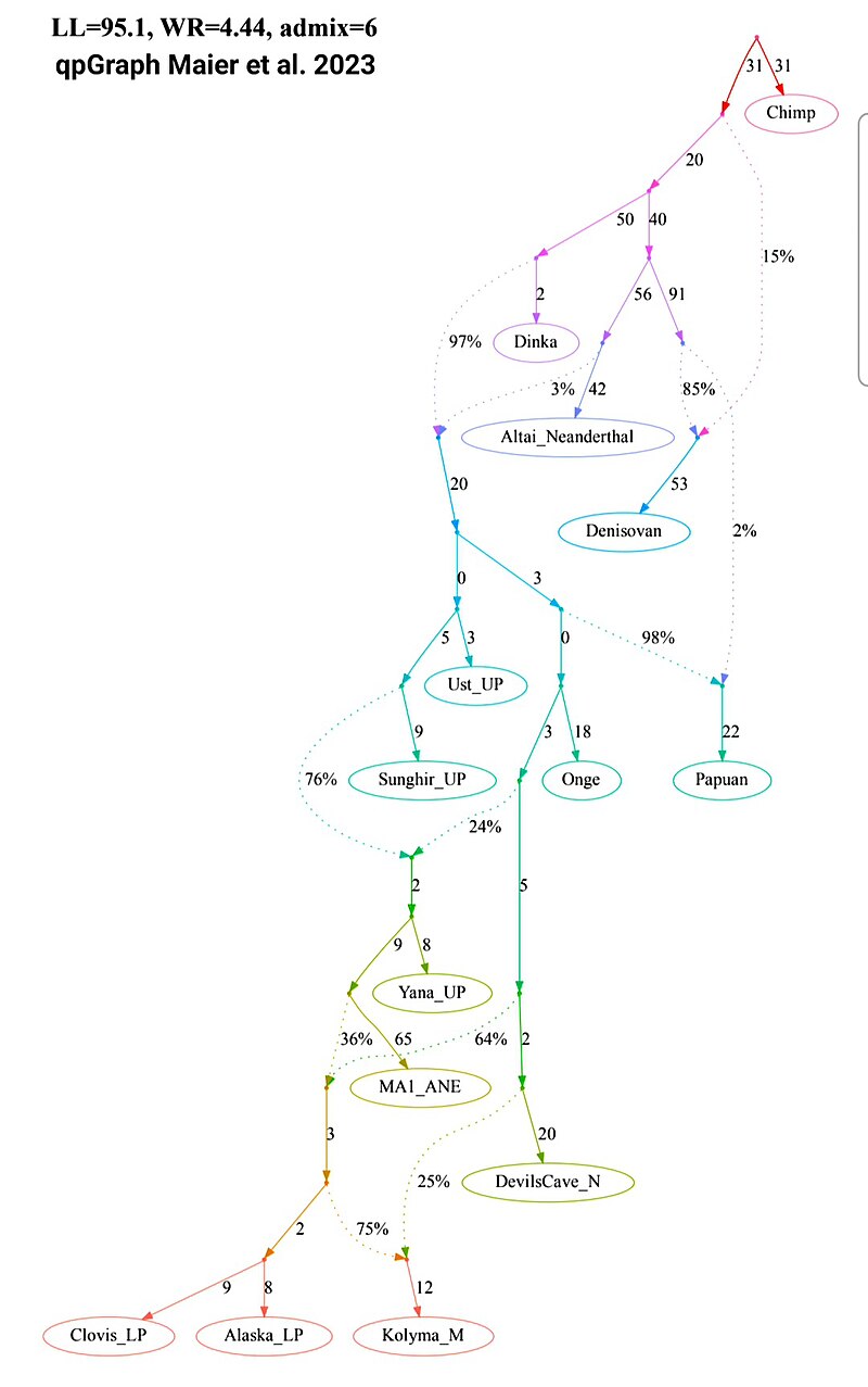 A qpGraph (best fit) by Maier et al. 2023, showing the formation of Ancient North Siberians/Eurasians (ANS/ANE) and their subsequent contribution to the formation of Ancient Paleo-Siberians and Native Americans.[24]
