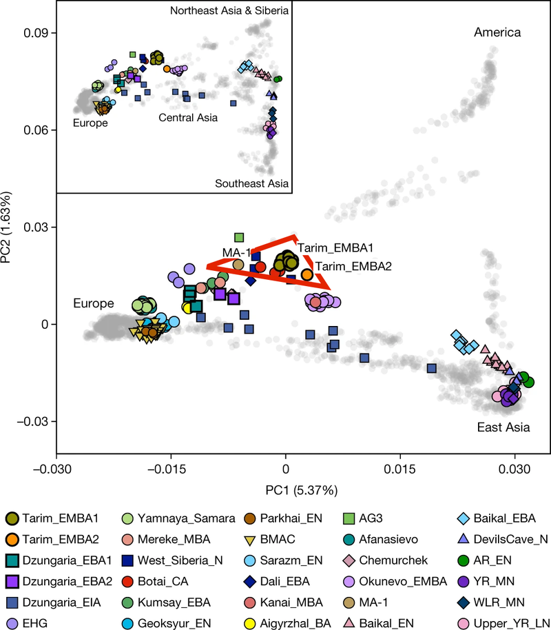 Zhang et al. (2021) proposed that the 'Western' like features of the earlier Tarim mummies could be attributed to their Ancient North Eurasian ancestry.[80] Previous craniometric analyses on the early Tarim mummies found that they formed their own cluster, and clustered with neither European-related Steppe pastoralists of the Andronovo and Afanasievo cultures, nor with inhabitants of the Western Asian BMAC culture, nor with East Asian populations further east.[81]