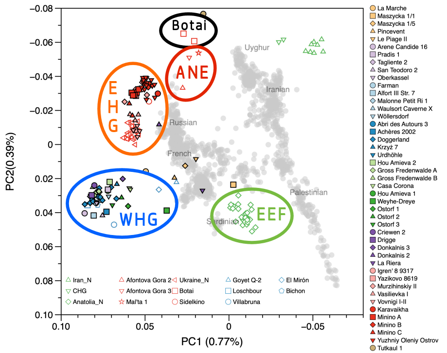 Genetically, the Ancient North Eurasians (ANE, red circle) were most closely related to the later Eastern Hunter Gatherers (EHG, orange circle) and the Botai culture (black circle).