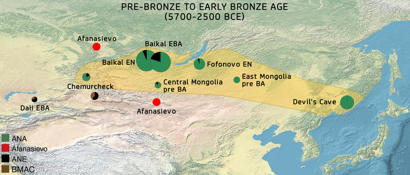 The Ancient Northeast Asians (ANA, yellow area) are defined as a cluster of Neolithic populations from the Altai Mountains to the Pacific coast. They were bordered by Western Eurasian populations to the west, which combined BMAC, Afanasievo and Ancient North Eurasian (ANE) ancestry.[1]
