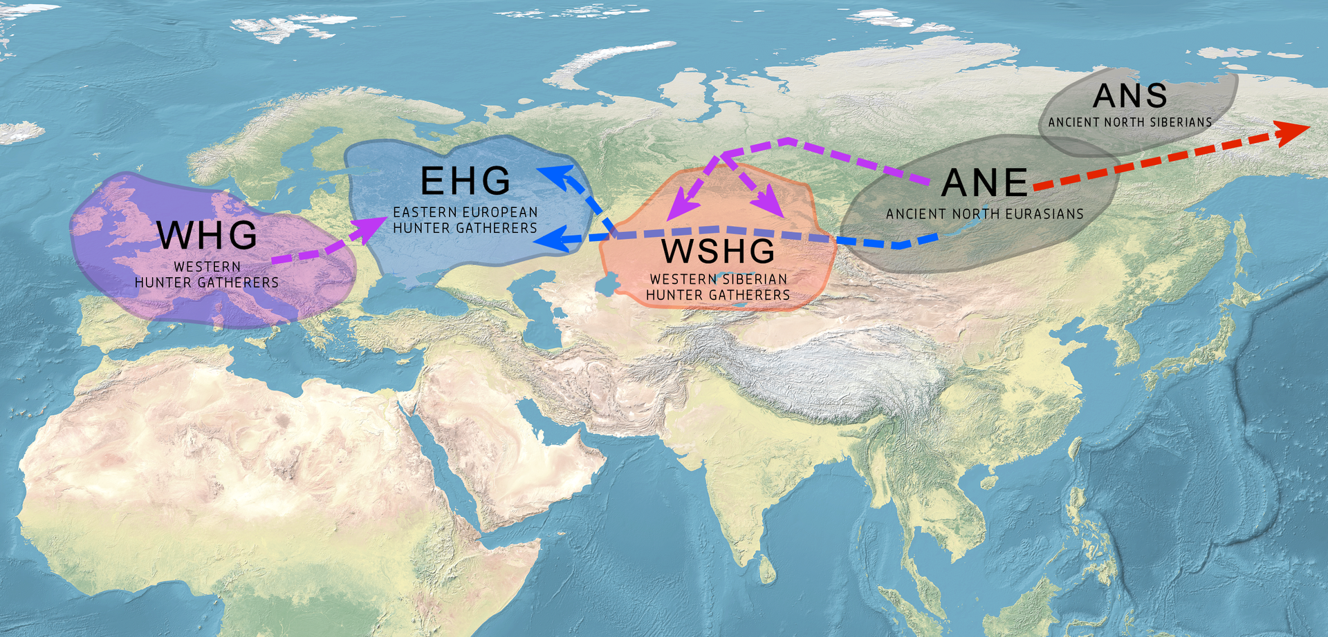 "The Eastern Hunter Gatherer genetic profile is mainly derived from Ancient North Eurasian (ANE) ancestry, which was introduced from Siberia,[4] with a secondary and smaller admixture of European Western Hunter-Gatherers (WHG).[5][6] Still, the relationship between the ANE and EHG ancestral components is not yet well understood due to lack of samples that could bridge the spatiotemporal gap.[5] "