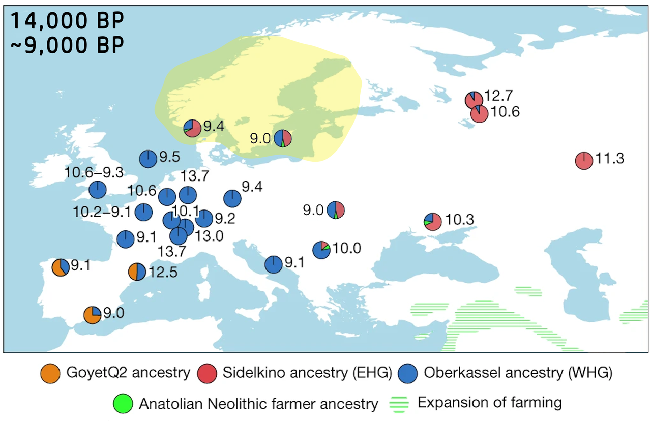 아래 유전자 분석기간은 14000 - 9000 BP (Before Present)인데, EHG 분포를 나타내고 있다.