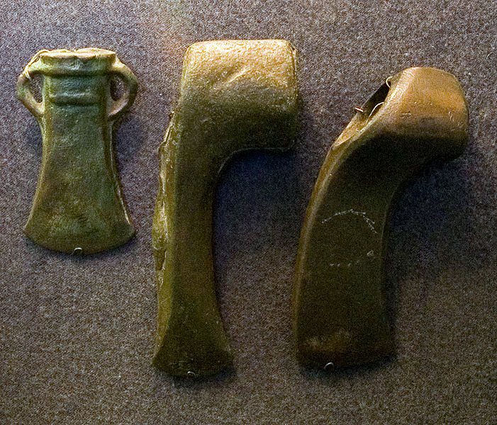 Sintashta artefact types such as spearheads, trilobed arrowheads, chisels, and large shaft-hole axes were taken east.[47] Many Sintashta graves are furnished with weapons, although the composite bow associated later with chariotry does not appear. Higher-status grave goods include chariots, as well as axes, mace-heads, spearheads, and cheek-pieces. Sintashta sites have produced finds of horn and bone, interpreted as furniture (grips, arrow rests, bow ends, string loops) of bows; there is no indication that the bending parts of these bows included anything other than wood.[48]