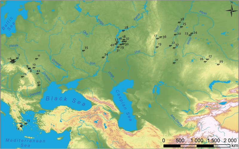 - Dispersion of double-horse burials ca. 2000-1400/1300 BCE.[15] Horses were domesticated on the Pontic-Caspian steppe.[16]