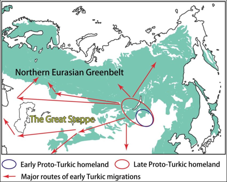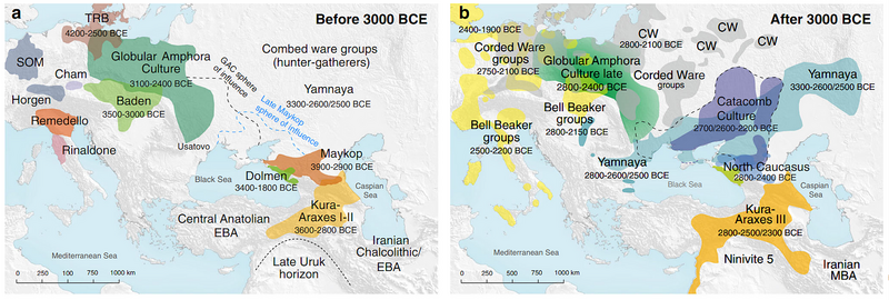 "상기 청동기 철기 시대 초원인구의 유전자 표를 보면, 중앙아시아 서쪽의 Yamnaya culture, Afansievo, Andronovo, Srubnaya, Sintashta culture 등은 동유럽 수렵인그룹(EHG), 코카서스수렵인그룹(CHG) 유전자가 주를 이루고, 동쪽의 Scytho-Siberians은 동북아시아인, 동유럽수렵인그룹(EHG), 코카서스수렵인그룹(CHG), 그리고 약간의 동아시아인 등의 유전인자가 혼재하고 있다.