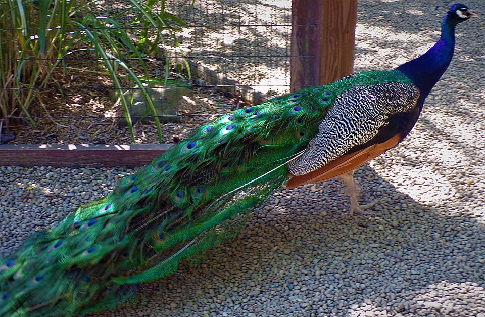 A peacock walking freely around a zoo (source : Wikipedia)