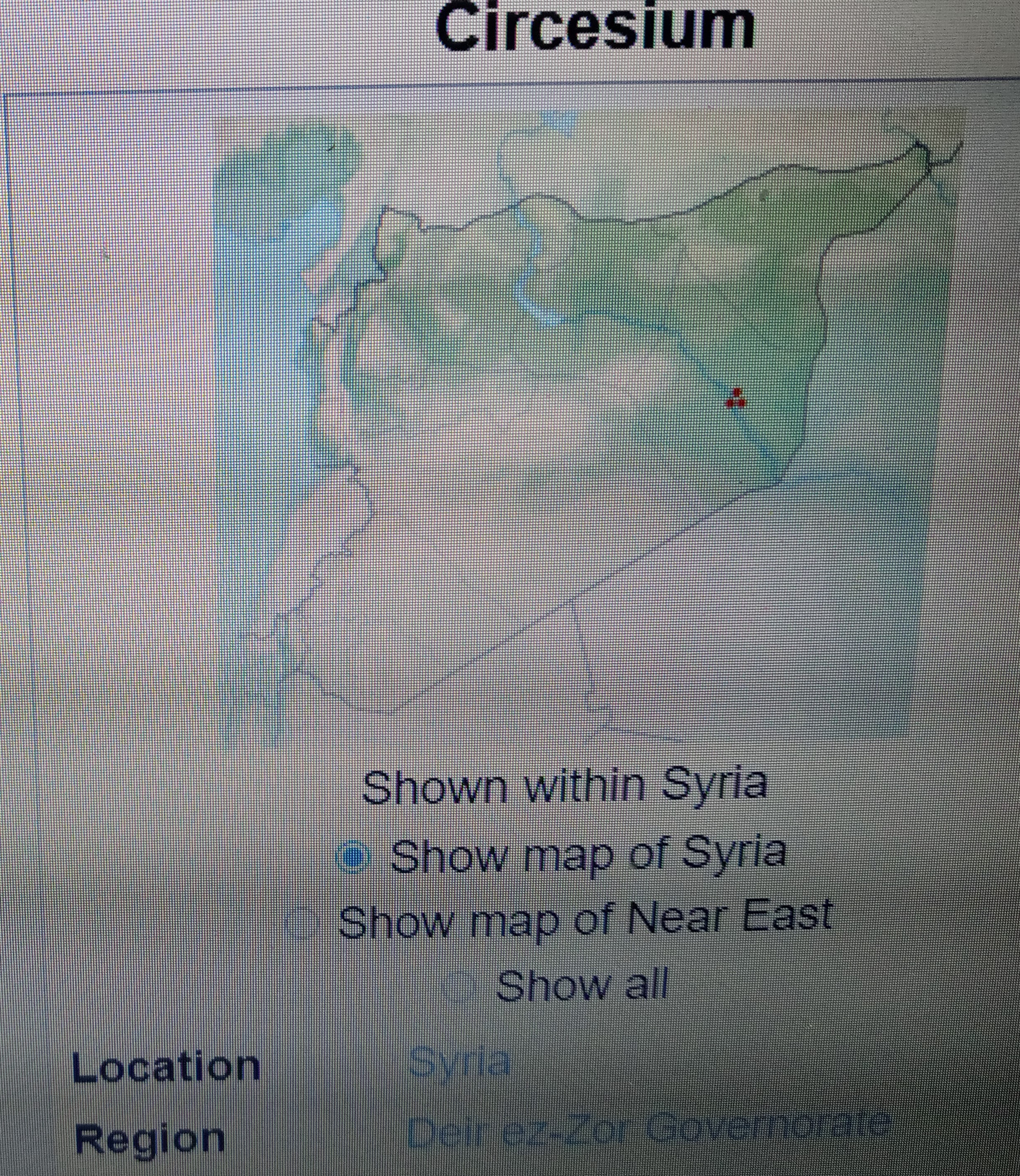"Circesium (Classical Syriac: ܩܪܩܣܝܢ Qerqesīn, Ancient Greek: Κιρκήσιον),[1] known in Arabic as al-Qarqisiya, was a Roman fortress city near the junction of the Euphrates and Khabur rivers, located at the empire's eastern frontier with the Sasanian Empire. Procopius calls it the "farthest fortress" (φρούριον ἔσχατον) of the Romans.[2] It was later conquered by the Muslim Arabs in the 7th century and was often a point of contention between various Muslim states due to its strategic location between Syria and Iraq. The modern town of al-Busayra corresponds with the site of Circesium.