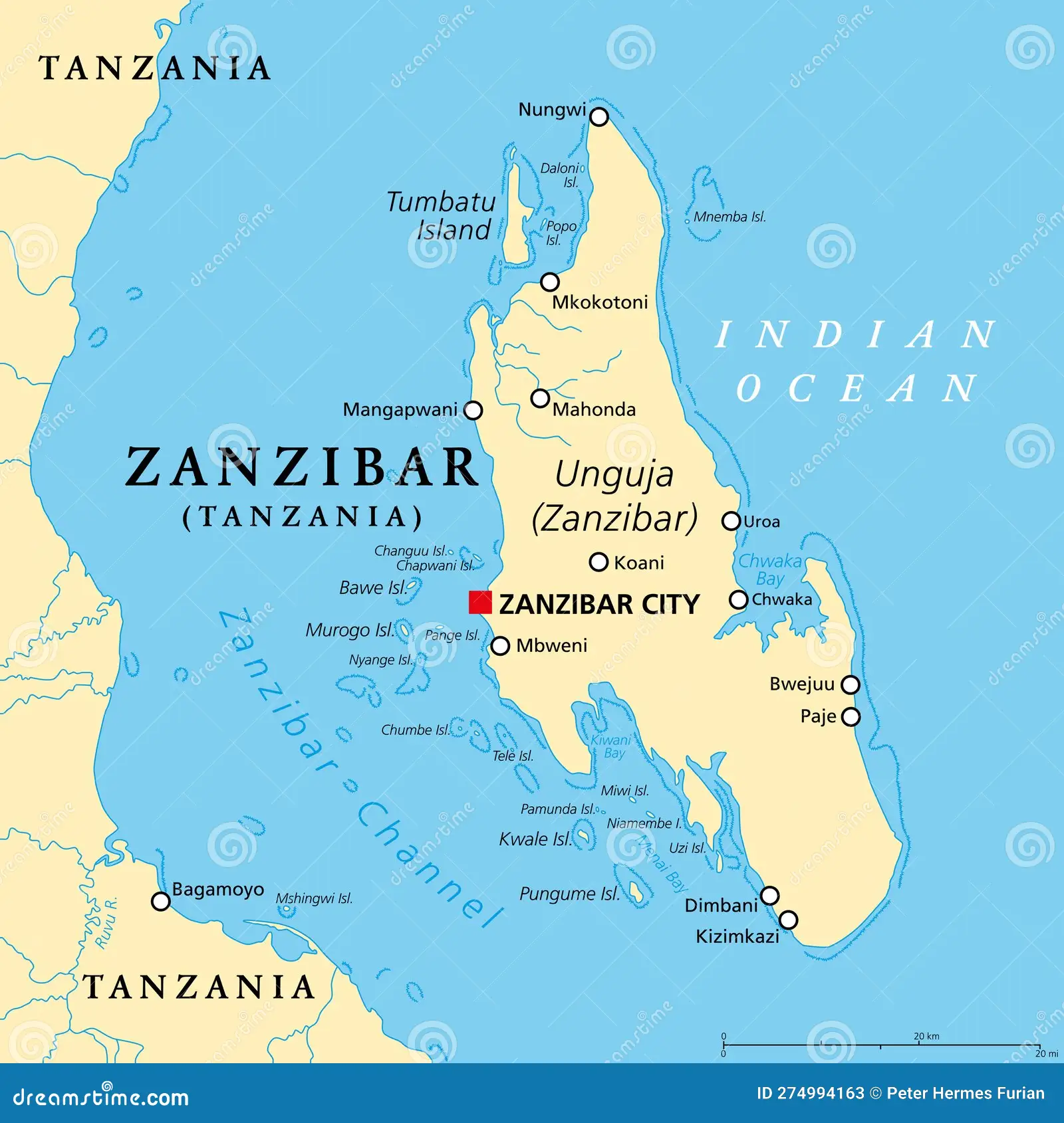 Zanzibar에는 2만년전부터 사람이 살았다. Zanzibar에 대한 가장 오래된 기록은 이 섬들이 아프리카 대호수들, 소말리아반도, 아라비아반도, 이란, 그리고 인도 부속대륙과 사이의 무역항로의 근거지가 되었을 때였다. Unguja(상기 지도 참조)는, 비록 값어치 있는 물건 유적들이 별로 발견되지 않았지만, 보호되고 방어할 수 있는 항구를 제공했다. 오만인과 예멘인들은 Zanzibar city(stone town)에 정착했는데, 스왈리해안의 타운들과 무역하기 편리한 거점이었기 때문이다. 그들은 이 섬들에 군사기지를 설립하였고, 대호수 아프리카지역에 처음으로 모스크들을 세웠다. (상기 내용)