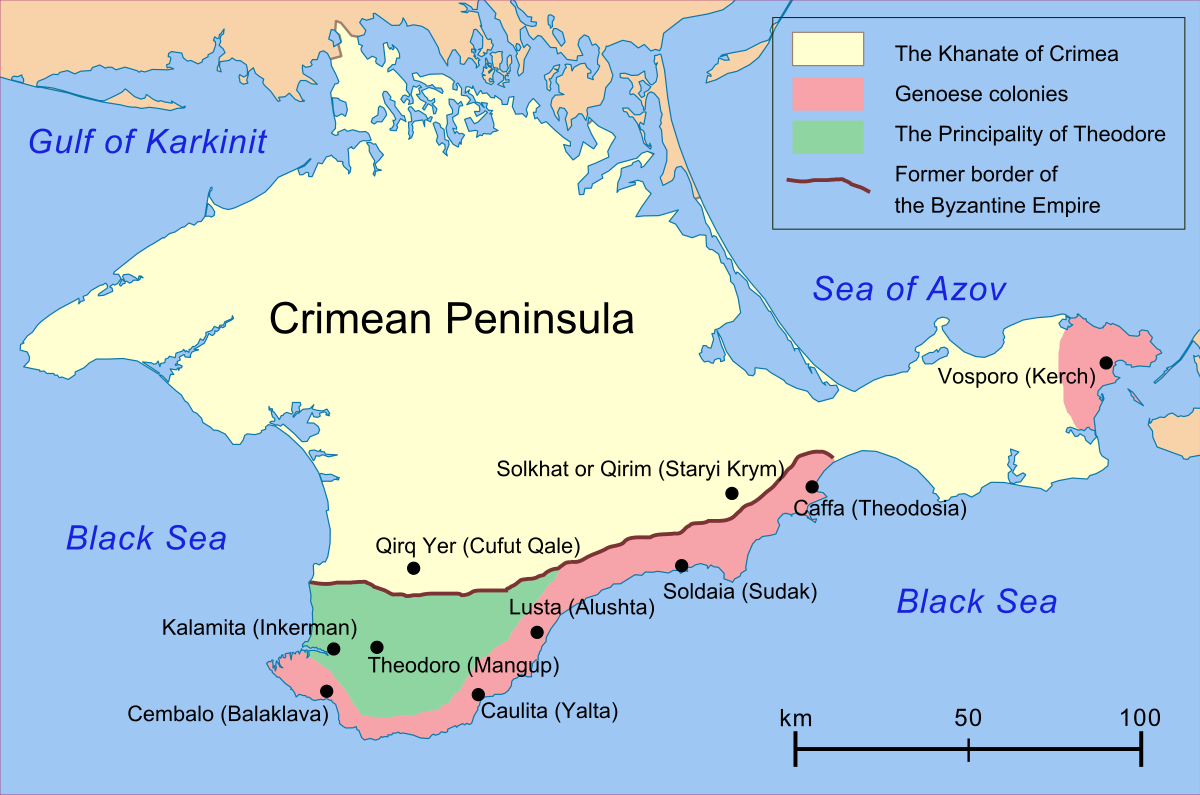 즉 크리미아반도는 원래 스키타이인의 지역이었는데, BC 513년 페르시아의 아케메네스제국이 점령했고, BC 63년부터 로마의 식민지로 있었다. 특히 남쪽 해안은 로마제국, 비잔틴제국의 식민지였으며, 내륙쪽은 보다 많은 침범을 겪어 고트족, Alans, 훈족, Bulgars (부여족), 하자르족, 킵착, 몽골 등의 점령지가 되었다고 언급되고 있다.