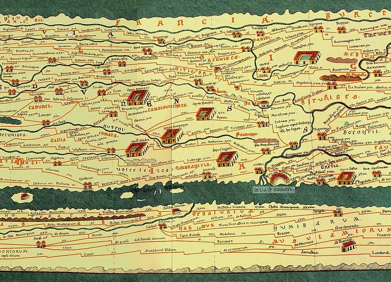 The Franks are mentioned in the Tabula Peutingeriana, an atlas of Roman roads. It is a 13th-century copy of a 4th or 5th century document that reflects information from the 3rd century. The Romans knew the shape of Europe, but their knowledge is not evident from the map, which was only a practical guide to the roads to be followed from point to point. In the middle Rhine region of the map, the word Francia is close to a misspelling of Bructeri. Beyond Mainz is Suevia, the country of the Suebi, and beyond that is Alamannia, the country of the Alamanni. Four tribes at the mouth of the Rhine are depicted: the Chauci, the Amsivarii ('Ems dwellers'), the Cherusci and the Chamavi, followed by qui et Pranci ('who are also Franks'). This implies that the Chamavi were considered Franks. The Tabula was probably based on the Orbis Pictus, a map of twenty years' labour commissioned by Augustus and then kept by the Roman's treasury department for the assessment of taxes. It did not survive as such. Information about the imperial divisions of Gaul probably derives from it.