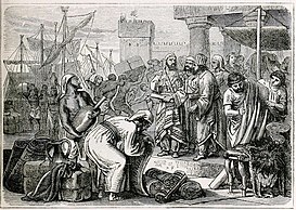 A unique concentration in Phoenicia of silver hoards dated some time during its high point contains hacksilver (used for currency) that bears lead isotope ratios matching ores in Sardinia and Spain.[46] This metallic evidence indicates the extent of Phoenician trade networks. It also seems to confirm the Biblical attestation of a western Mediterranean port city, Tarshish, supplying King Solomon of Israel with silver via Phoenicia.[47]