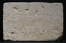 The name Phoenician is by convention given to inscriptions beginning around 1050 BCE, because Phoenician, Hebrew, and other Canaanite dialects were largely indistinguishable before that time.[39][18] The so-called Ahiram epitaph, engraved on the sarcophagus of King Ahiram from about 1000 BCE, shows a fully developed Phoenician script.[58][59][60]
