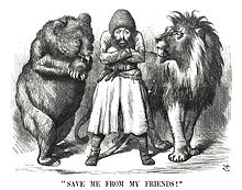 At midcentury British observers and travellers presented a negative view of Russia as a barbaric and backward nation. The English media depicted the Russians as superstitious, passive, and deserving of their autocratic tsar. In this view, "barbarism" stood in contrast to "civilised" Britain.[19] In 1874, tension lessened as Queen Victoria's second son married the only daughter of Tsar Alexander II, followed by a cordial state visit by the tsar. The goodwill lasted no more than three years, when structural forces again pushed the two nations to the verge of war.[20]