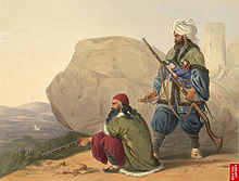 In 1839, acting Captain James Abbott of the Bengal Artillery undertook a mission to the Khanate of Khiva in an attempt to negotiate the release of Russian slaves that would deny the Russians a pretext for invading Khiva. If war had already broken out, Abbot was instructed to attempt to negotiate a settlement.[45] The attempted Russian assault on Khiva may have been in response to Britain's "forward policy" on Afghanistan, however it failed to reach Khiva due to the severe winter conditions. Of the 5,000 men who had left Orenburg, only 4,000 returned.[27] Abbott was hampered by a lack of understanding of Khivan language and culture, and the attempt to release Russian slaves was unsuccessful. He did agree with the Khivan ruler, Allah Quli Khan, to establishing a British agent to Khiva and to mediate between Khiva and Russia. Abbott set off from Khiva in 1840 towards Russia to commence negotiations, which he did on his own initiative and it was not authorised by his superiors. His caravan was attacked by Khazakhs and he was wounded in the hand and taken hostage, however he and his party were released because they feared retribution. He reached Saint Petersburg but the attempt at mediation failed. His bravery was recognized through promotion to full Captain.[45] In the same year, Lieutenant Richmond Shakespear of the Bengal Artillery was successful in negotiating the release of 416 Russian captives, whom he escorted into Russia.[46] He was knighted for this undertaking.[47]