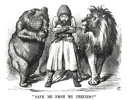 "The Great Game" was a political and diplomatic confrontation that existed for most of the 19th century between Great Britain and Russia over Afghanistan and neighbouring territories in Central and South Asia. Britain was fearful of Russia invading India to add to the vast empire that Russia was building in Asia. As a result there was a deep atmosphere of distrust and the talk of war between the two empires.[1][2][3] Britain made it a high priority to protect all the approaches to India, and the "great game" is primarily how the British did this. Historians with access to the archives have concluded that Russia had no plans involving India, as the Russians repeatedly stated.[4]