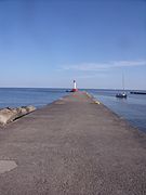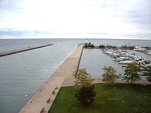 Baymouth bars built by prevailing winds and currents have created a significant number of lagoons and sheltered harbors, mostly near (but not limited to) Prince Edward County, Ontario and the easternmost shores. Perhaps the best-known example is Toronto Bay, chosen as the site of the Upper Canada (Ontario) capital for its strategic harbour. Other prominent examples include Hamilton Harbour, Irondequoit Bay, Presqu'ile Bay, and Sodus Bay. The bars themselves are the sites of long beaches, such as Sandbanks Provincial Park and Sandy Island Beach State Park. These sand bars are often associated with large wetlands, which support large numbers of plant and animal species, as well as providing important rest areas for migratory birds.[13][14] Presqu'ile, on the north shore of Lake Ontario, is particularly significant in this regard. One unique feature of the lake is the Z-shaped Bay of Quinte which separates Prince Edward County from the Ontario mainland, save for a 2-mile (3.2 km) isthmus near Trenton; this feature also supports many wetlands and aquatic plants, as well as associated fisheries.