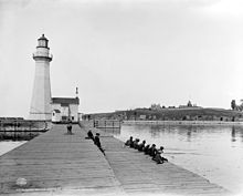 Fishing at Pierhead Light in Oswego, New York, c. 1900. Fort Ontario behind.
