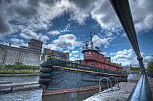 Tugboat Daniel McAllister, with grain elevators behind, Lachine Canal.