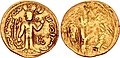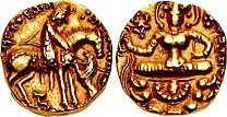 A rare gold coin of Toramana in the style of the Guptas. The obverse legend reads: "The lord of the Earth, Toramana, having conquered the Earth, wins Heaven".[55][56]