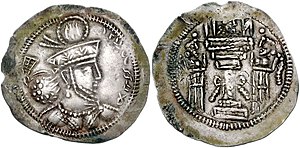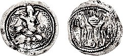 The earliest Alchon Hun coins were based on Sasanian designs, often with the simple addition of the Alchon tamgha and a mention of "Alchon" or "Alkhan".[21] Various coins minted in Bactria and based on Sasanian designs are known, often with busts imitating Sasanian kings Shapur II (r.309 to 379 CE) and Shapur III (r.383 to 388 CE), with attendants to a fire altar on the reverse.[29][101] It is thought that the Sasanids lost control of Bactria to the Kidarites during the reign of Shapur II circa 370 CE, followed by the Hephthalites, and subsequently by the Alchon.[23]