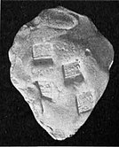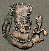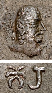 The name "Alchon" generally given to them comes from the Bactrian legend of their early coinage, where they simply imitated Sassanian coins to which they added the name "alchono" (αλχονο, also αλχοννο)[16] in Bactrian script (a slight adaptation of the Greek script) and the tamgha symbol of their clan.[17][18][11][19] Several original coins such as those of Khingila also bear the mention "alchono" together with the Tamgha symbol.[11] Philologically, "alchono" (αλχονο) may be a combination of al- for Aryan and -xono for Huns, although this remains hypothetical.[12] Another etymology could be al-, Turkish for scarlet, and -xono for Huns, meaning "Red Huns", red being a symbol of the south among steppe nomads.[20]