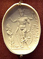Vishnu Nicolo Seal representing Vishnu with a worshipper (probably Mihirakula), 4th–6th century CE. The inscription in cursive Bactrian reads: "Mihira, Vishnu and Shiva". British Museum.