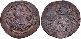 As they invaded northern and central India circa 500 CE, the Alchon Huns issued several types of coinage on the model of the Sasanian Empire, with ruler in profile on the obverse and sacred fire with attendants on the reverse.[97] It is thought that in the process of minting coins in occupied lands, they transmitted Sasanian coin designs to northern and western India.[97] This created a major type of Indian coinage called "Indo-Sasanian coinage", which lasted in degraded form until the 12th century CE as far as the Gangetic region.[97]
