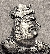 Around 430 King Khingila, the most notable Alchon ruler, and the first one to be named and represented on his coins with the legend "χιγγιλο" (Kiggilo) in Bactrian, emerged and took control of the routes across the Hindu Kush from the Kidarites.[7][1] He seems to have been a contemporary of the Sassanian ruler Bahram V.[1] As the Alchons took control, diplomatic missions were established in 457 with China.[32]:162 Khingila, under the name Shengil, was called "King of India" in the Shahnameh of Ferdowsi.[6]