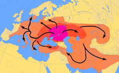 Indo European migrations Scheme of Indo-European language dispersals from c. 4000 to 1000 BCE according to the widely held Kurgan hypothesis. – Center: Steppe cultures 1 (black): Anatolian languages (archaic PIE) 2 (black): Afanasievo culture (early PIE) 3 (black): Yamnaya culture expansion (Pontic-Caspian steppe, Danube Valley) (late PIE) 4A (black): Western Corded Ware 4B-C (blue & dark blue):..